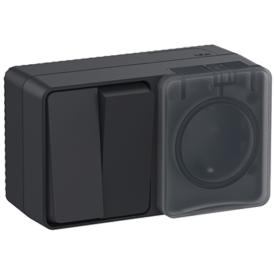 Блок Schneider Electric ATN544074 AtlasDesign Profi54 (выключатель 2-клавишный 10 А + розетка 1-местная 16 А с заземлением, шторками и защитной крышкой) открытой установки, антрацит