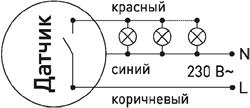 коричневый провод - фаза (L), синий провод - нейтраль (N), красный провод - нагрузка.