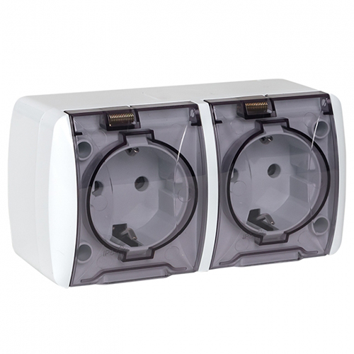 Розетка двухместная EKF EQR16-129-30-54-T "Владивосток" (16 А, IP54) открытой установки, с заземлением, с прозрачными крышками, белый