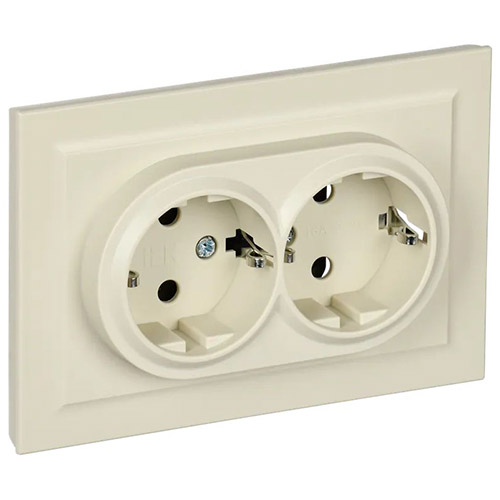 Розетка двухместная IEK РСш12-3-БрКр Brite (16 А, IP20) скрытой установки, с заземлением и защитными шторками, в сборе, бежевый