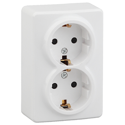 Розетка двухместная "Эра" 11-2206-01 "Эксперт" (16 АХ, 250 В, IP20) открытой установки, с заземлением, с защитными шторками, белый