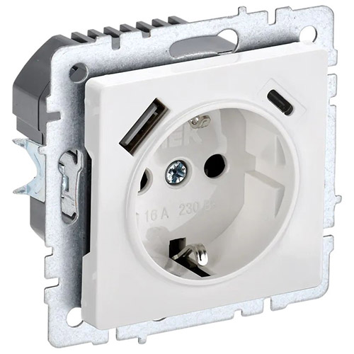 Розетка одноместная IEK РЮш11-1-БрБ Brite (16 А, IP20) скрытой установки, с заземлением и защитными шторками, c 2 разъемами USB Type А / Type С (12 В, 3,1 А), белый