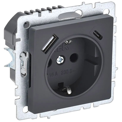 Розетка одноместная IEK РЮш11-1-БрГ Brite (16 А, IP20) скрытой установки, с заземлением и защитными шторками, c 2 разъемами USB Type А / Type С (12 В, 3,1 А), графит