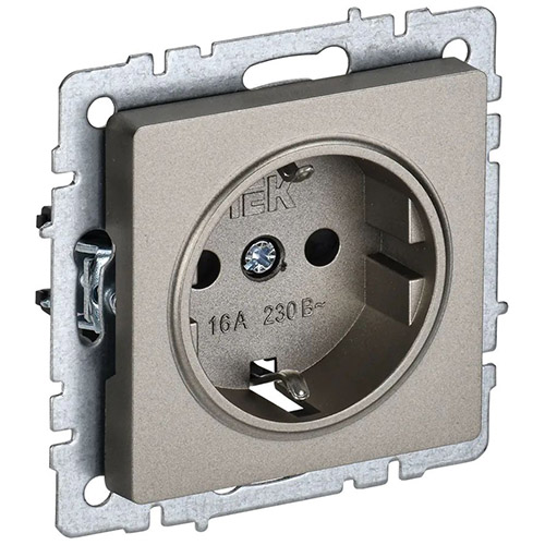 Розетка одноместная IEK РС14-1-0-БрШ Brite (16 А, IP20) скрытой установки, с заземлением и защитными шторками, шампань