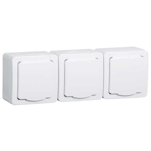 Розетка трехместная горизонтальная IEK РСб23-3-ГПБб "Гермес Plus" (16 А, IP54) с заземлением и шторками, с крышками, открытой установки, белый