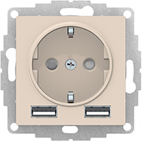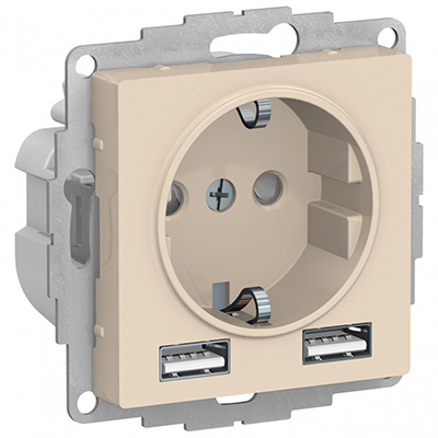 Розетка одноместная Schneider Electric ATN000230 AtlasDesign (16 А, 2 USB A+A, 5В/2,4А, 2х5В/1,2А) скрытой установки, с заземлением и защитными шторками, бежевый