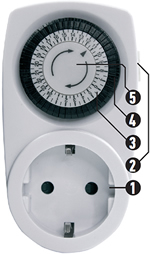 1 - розетка для подключения электроприборов. 2 - переключатель режимов работы: - "Таймер", I - "Постоянно включено".3 - шкала времени. 4 - программные клавиши. 5 - указатель времени. |