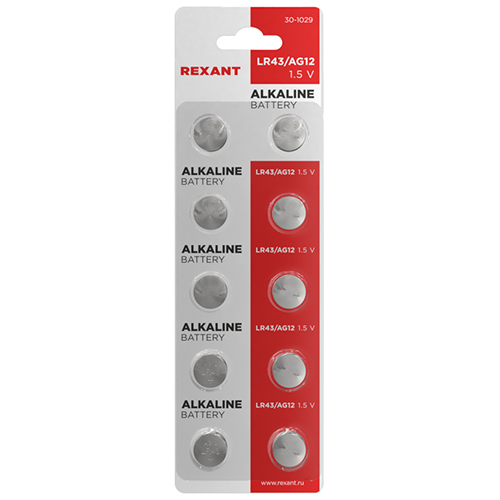 Батарейка алкалиновая LR43 Rexant 30-1029 (1,5 В), 10 шт., блистер
