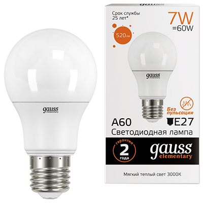 Лампа светодиодная Gauss 23217A Elementary (A60, 220 В, E27, 7 Вт, 520 лм, 3000 К)