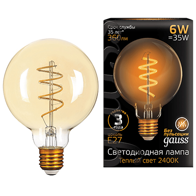 Лампа светодиодная декоративная Gauss 105802007 Filament Flexible (G95 шар, 220 В, Е27, 6 Вт, 360 лм, 2400 К), золотистый