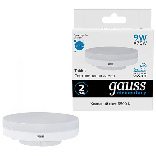 Лампа светодиодная Gauss 83839 Elementary (tablet, 9 Вт, GX53, 700 лм, 6500 К)