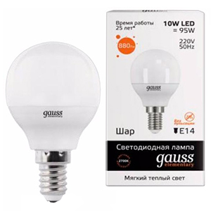 Лампа светодиодная Gauss Elementary 53110 (10 Вт, E14, G45 шар, 880 лм, 2700 К)
