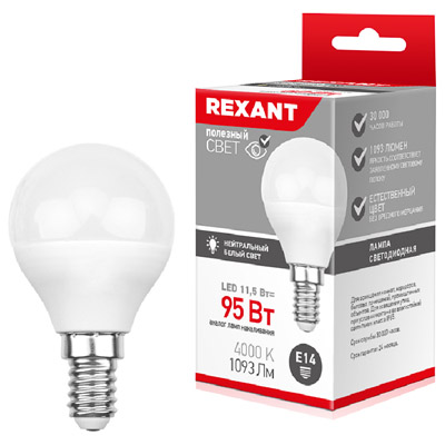 Лампа светодиодная Rexant 604-042 (G45 шар, 220 В, E14, 11,5 Вт, 1093 лм), цвет свечения нейтральный белый