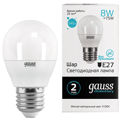 Лампа светодиодная Gauss 53228 Elementary (G45 шар, 220 В, Е27, 8 Вт, 540 лм, 4100 К)