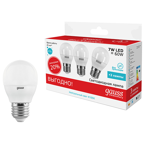 Лампы светодиодные Gauss 53227T Elementary (G45 шар, Е27, 7 Вт, 470 лм, 4100 К), упаковка 3 шт.