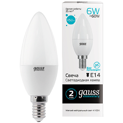 Лампа светодиодная Gauss 33126 Elementary (С37 свеча, 220 В, Е14, 6 Вт, 450 лм, 4100 К)
