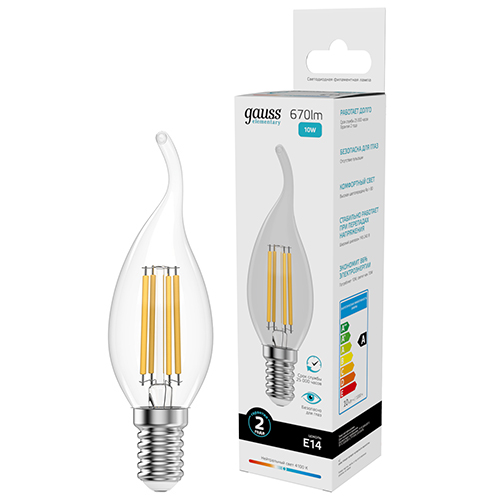 Лампа светодиодная Gauss 42120 Filament Elementary (СА35 свеча на ветру, Е14, 10 Вт, 670 лм, 4100 К, прозрачная колба)