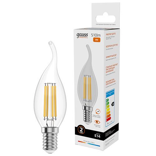 Лампа светодиодная Gauss 42118 Filament Elementary (СА35 свеча на ветру, Е14, 8 Вт, 510 лм, 2700 К, прозрачная колба)