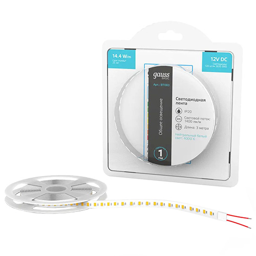 Лента светодиодная Gauss BT083 Basic (2835, 12 В, 14,4 Вт/м, 120 свд/м, 1400 лм/м, 4000 К, IP20)