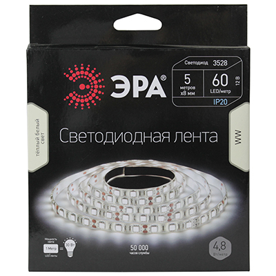 Лента светодиодная LS3528-60LED-IP20-WW-5m "Эра" (12 В, 4,8 Вт/м, 60 led/м), цвет свечения теплый белый