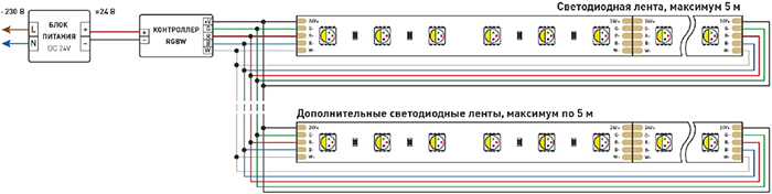 Максимальная длина подключения ленты - 5 метров (1 катушка).