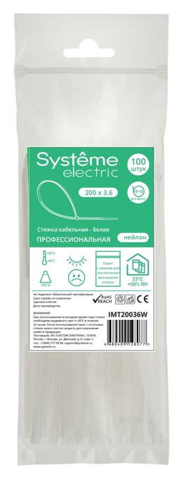 Стяжка кабельная нейлоновая 3,6 х 200 мм Systeme Electric IMT20036W, белый