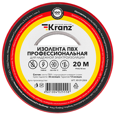 Профессиональная изоляционная лента Kranz класса Premium применяется для электрической изоляции, цветной маркировки, соединения, защиты от внешних факторов и герметизации кабеля, проводов и шнуров.