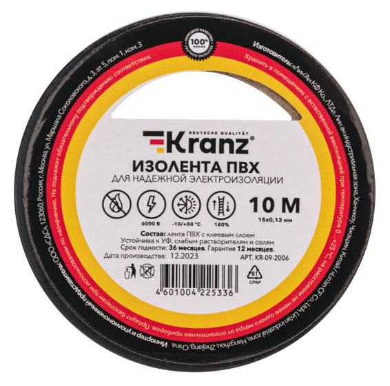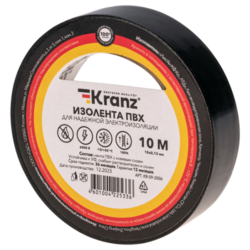 ПВХ изолента Kranz предназначена для электрической изоляции, цветной маркировки, соединения, защиты от внешних факторов и герметизации кабеля, проводов и шнуров.
