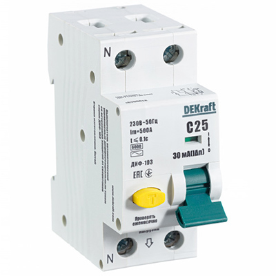 Автоматический выключатель дифференциального тока DEKraft ДИФ103-6кА-1N-25А-30-C (1Р+N, 25 А, характеристика C, 30 мА, 6 кА, тип АС)