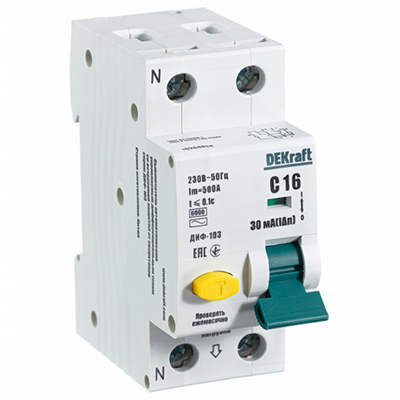 Автоматический выключатель дифференциального тока DEKraft ДИФ103-6кА-1N-16А-30-C (1Р+N, 16 А, характеристика C, 30 мА, 6 кА, тип АС)