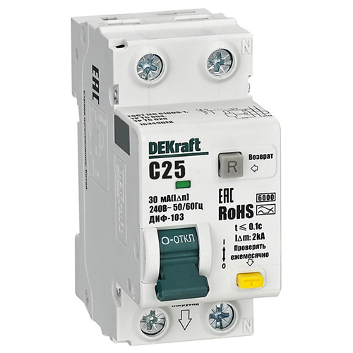 Автоматический выключатель дифференциального тока DEKraft ДИФ103-6кА-1N-25А-30-А-C (1Р+N, 25 А, характеристика C, 30 мА, 6 кА, тип А)
