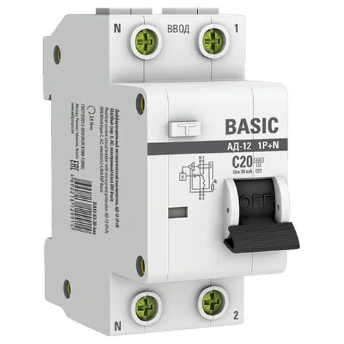 Автоматический выключатель дифференциального тока EKF АД-12 1P+N 20А Basic (характеристика C, 30 мА, тип АС электронный, 4,5 кА)