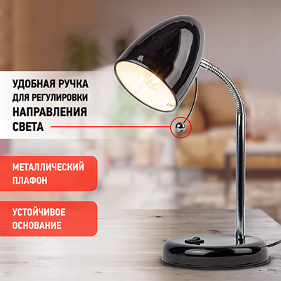 Компактный настольный светильник N-116-Е27-40W-BK "Эра" с цоколем Е27 может использоваться с лампой накаливания, компактной люминесцентной или светодиодной лампой.