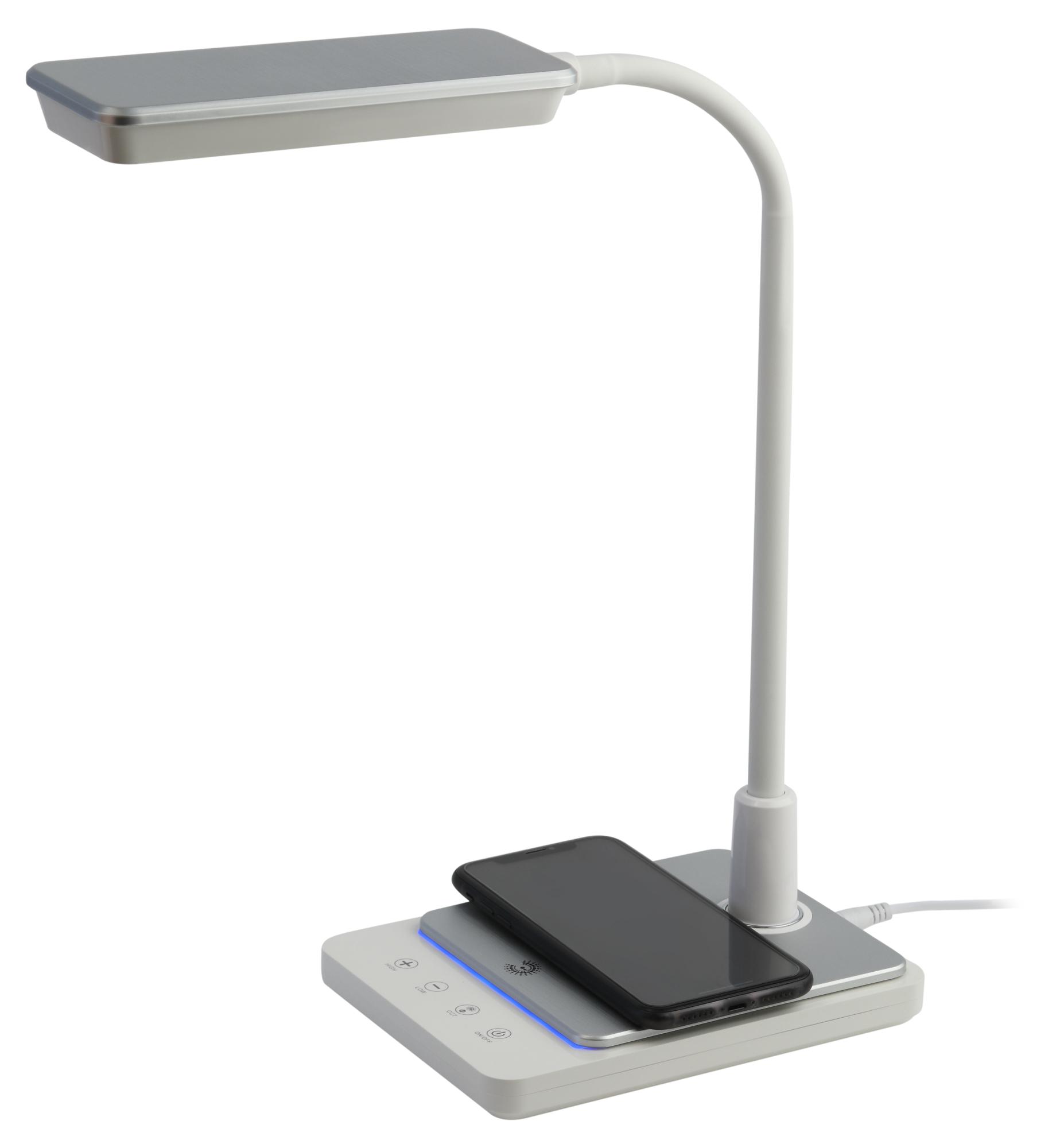 Настольный светильник ЭРА NLED-499-10W-W со светодиодами (LED) в качестве источников света. Оснащен сенсорным управлением с возможностью выбора цветовой температуры (теплый, нейтральный или холодный свет). Плавный диммер для регулировки яркости. Светильник сохраняет выбранные настройки при включении-выключении. Направление света регулируется наклоном и поворотом плафона в любом направлении. Светильник имеет встроенный модуль Qi для беспроводной зарядки мобильных устройств. Просто положите телефо