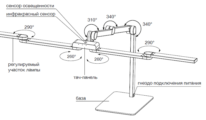 Настольная лампа-трансформер с множеством вариантов регулировки корпуса оснащена датчиком освещенности, таймером и сенсорным управлением.