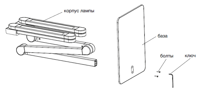 | В комплекте | основание, адаптер питания с проводом, болты и ключ для сборки лампы |
