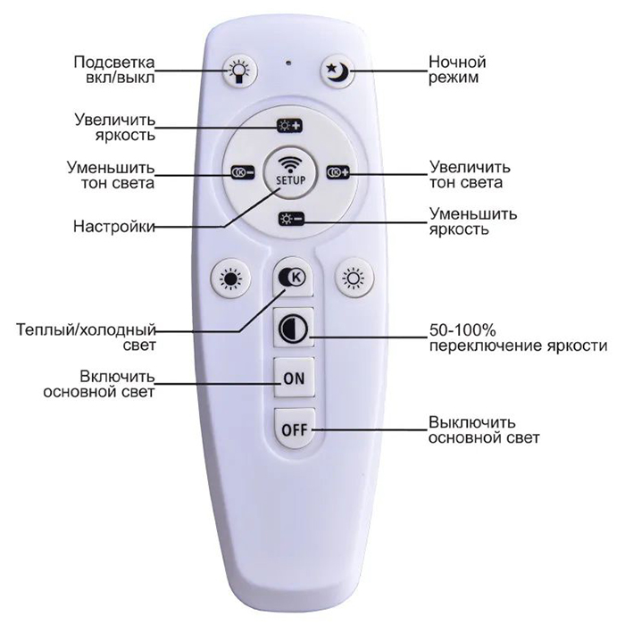 - Управление при помощи пульта дистанционного управления: регулировка цветовой температуры и яркости, режим ночника.
