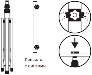Штатив поставляется в разобранном виде. Ослабьте винт штатива, раскройте опоры на максимально возможный угол. Выкрутите винт с пластиковым барашком из штатива в верхней его части, вставьте винт в центральное отверстие консоли, закрутите винт. |