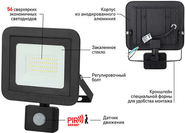 - Имеется возможность регулировки параметров датчика движения.