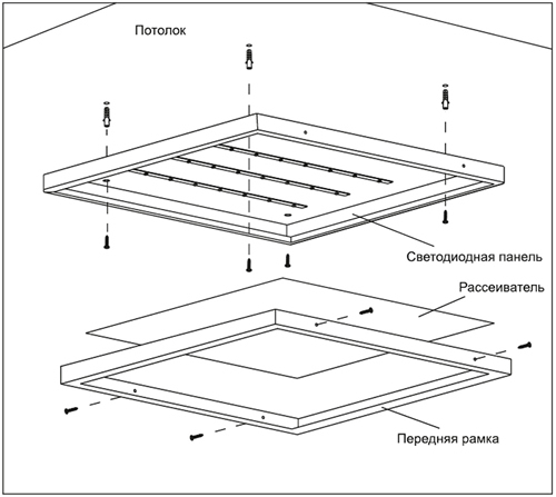 - Накладной монтаж светодиодной панели осуществляется непосредственно на поверхность потолка с креплением светильника через отверстия в корпусе (см. рисунок выше).